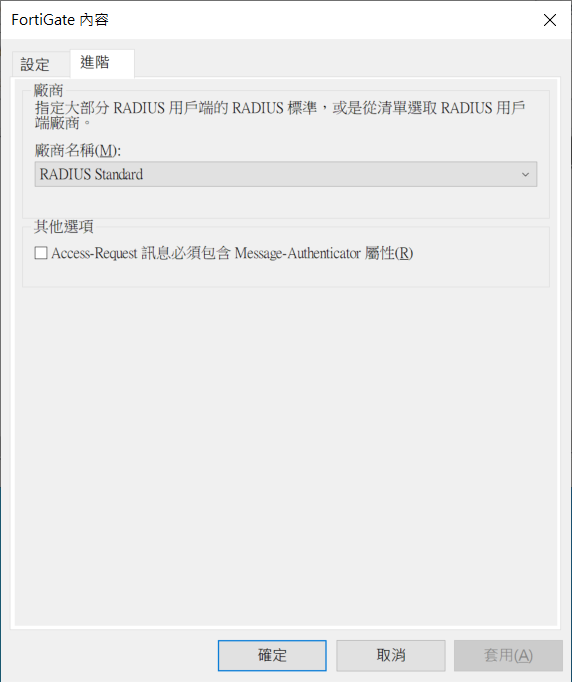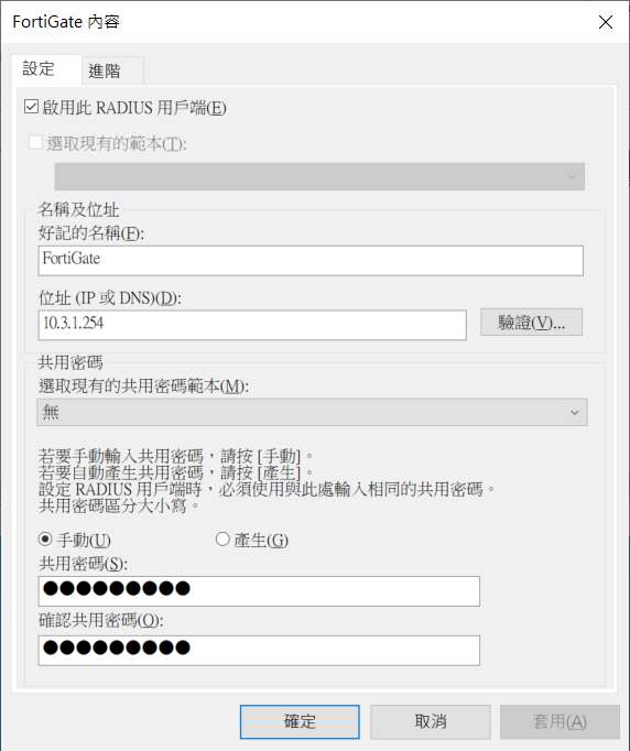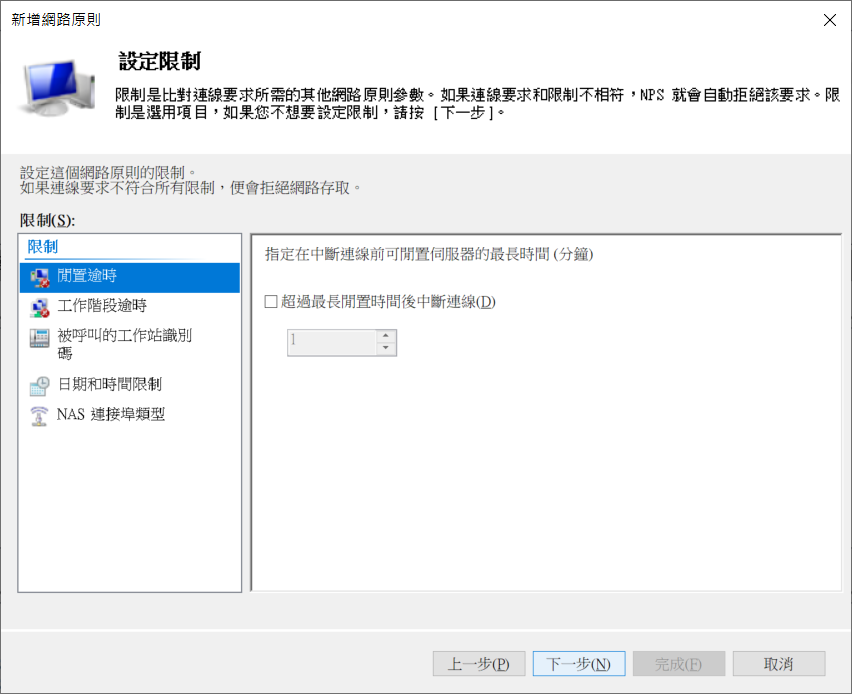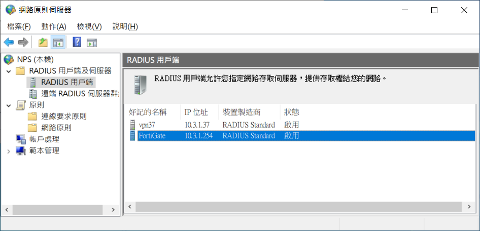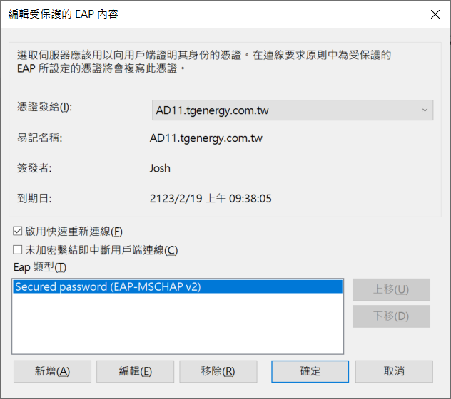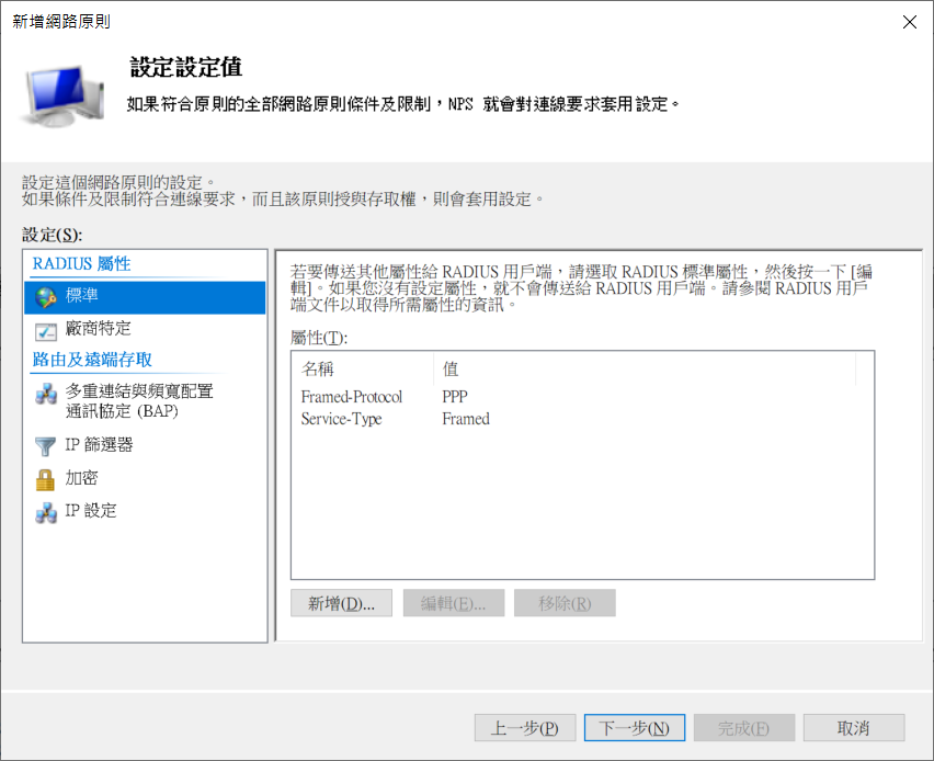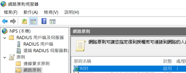 linux / windows 2023-03-15 0 Comment openssl 網關憑證 參加上方建立一把server.pfx(注意:必須有憑證密鑰匯入到server上) 先建立一個RADIUS用戶端 此頁預設 手工建立一個網路原則 此頁預設不動 此頁預設不動